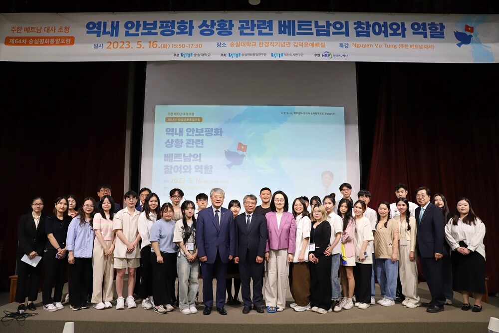 숭실대 숭실평화통일연구원이 웬 부 뚱 주한 베트남대사를 초청해 ‘제64차 숭실평화통일포럼’을 한 뒤 참석자들이 기념촬영하고 있다. 사진=숭실대 제공 |