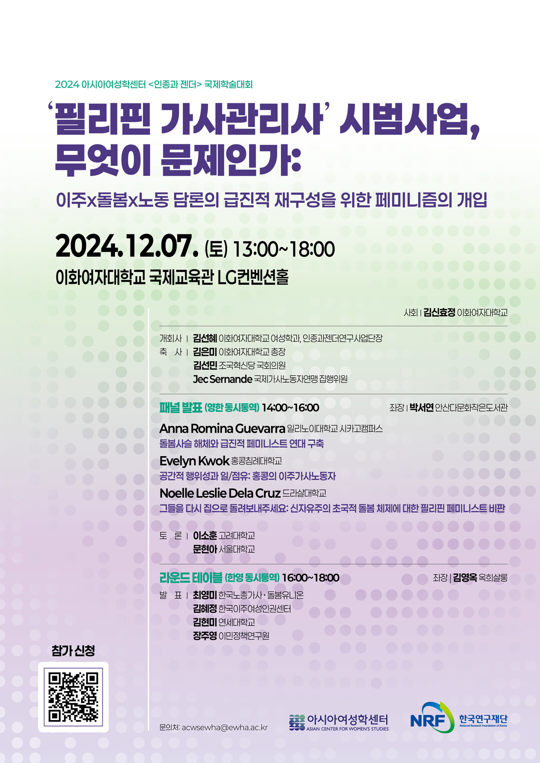 마지막 세션인 라운드 테이블에서는 최영미 한국노총 가사·돌봄유니온 위원장, 김혜정 한국이주여성인권센터 사무처장, 김현미 연세대 교수, 장주영 이민정책연구원 연구위원이 발표자로 나선다. 행사는 한영 동시통역으로 진행된다.