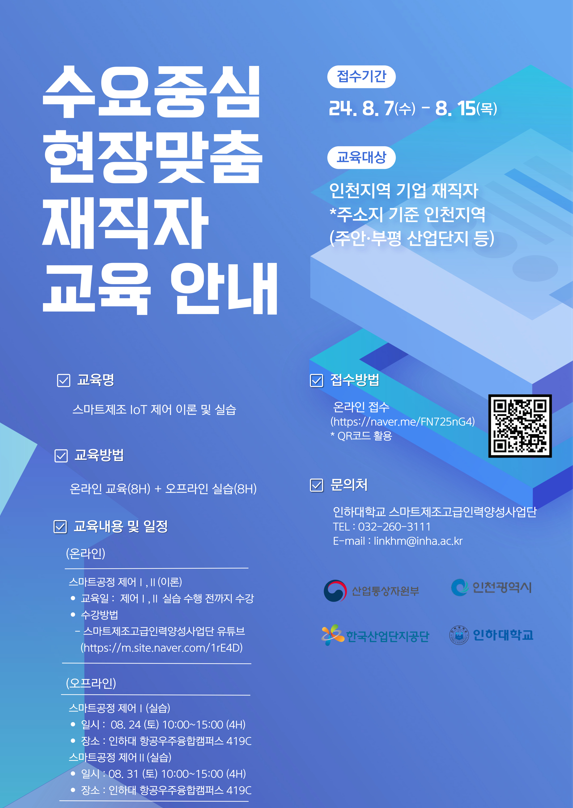 교육은 주소지 기준 인천지역 기업 재직자라면 누구든지 신청 및 참여할 수 있고 교육 참여 시 교보재(실습 키트)를 무상으로 제공하는 등 전액 무료로 진행된다.