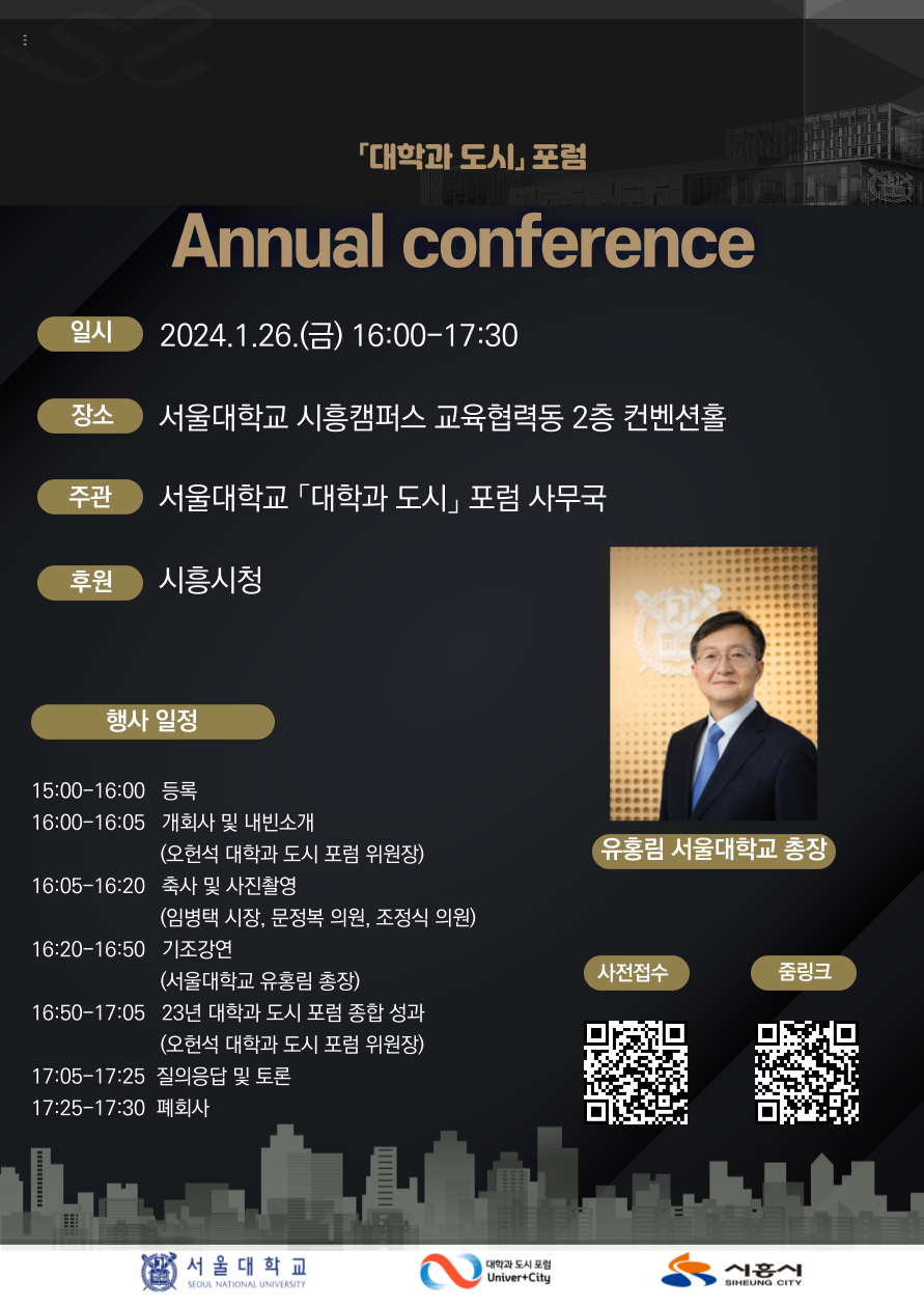 이번 통합 컨퍼런스에서는 서울대 유홍림 총장과 시흥시 임병택 시장이 지방자치단체와 대학의 협력 방안 그리고 2024년도 ‘대학과 도시’ 포럼 계획을 공유한다.