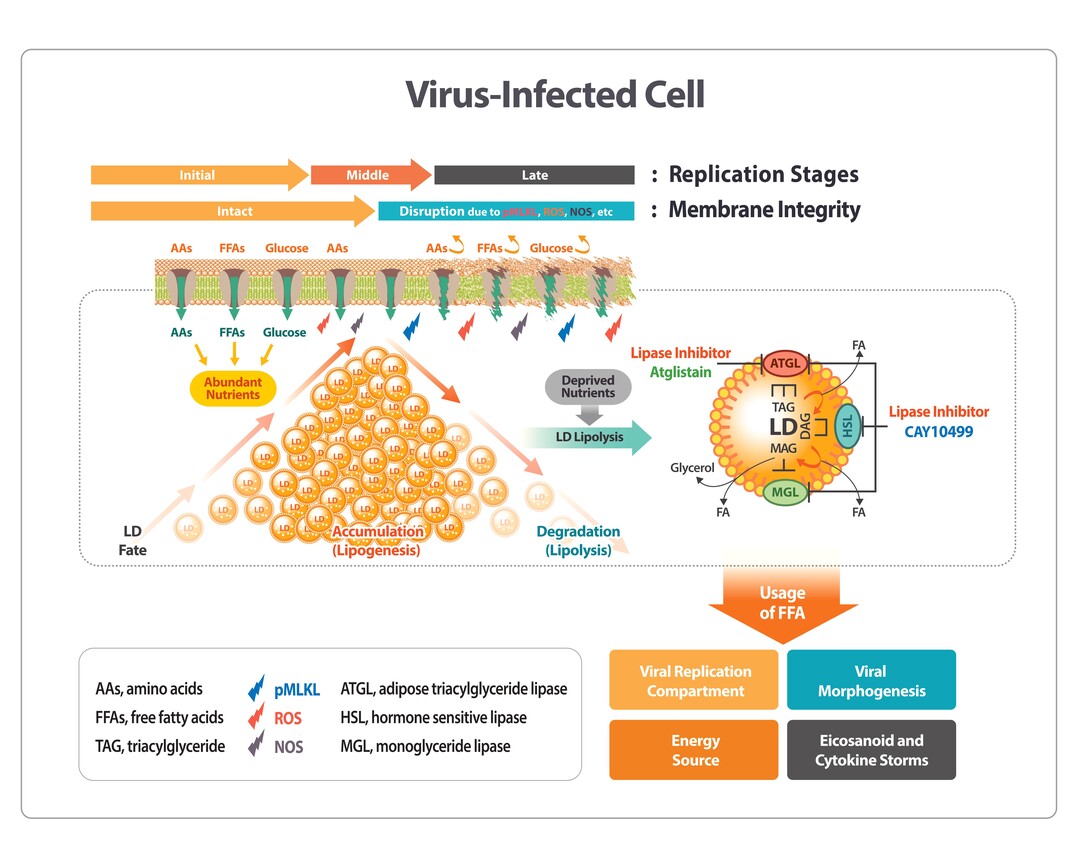 연구팀은 코로나19나 독감을 일으키는 다양한 RNA 바이러스들이 지방방울(lipid droplet)을 세포 내에 축적했다가 감염 후기가 되면 이를 지방분해효소인 ATGL과 HSL로 녹이는데, 이때 생성된 유리지방산을 이용해 바이러스를 증식한다는 사실을 규명해내고, 지방분해효소를 억제하는 물질 개발에 주력했다.