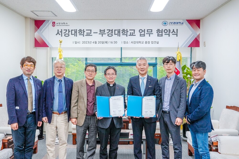 서강대와 부경대 관계자들이 지난 20일 반도체 인재양성 확대를 위한 업무협약을 체결한 후 기념촬영하고 있다. 사진=부경대 제공 |
