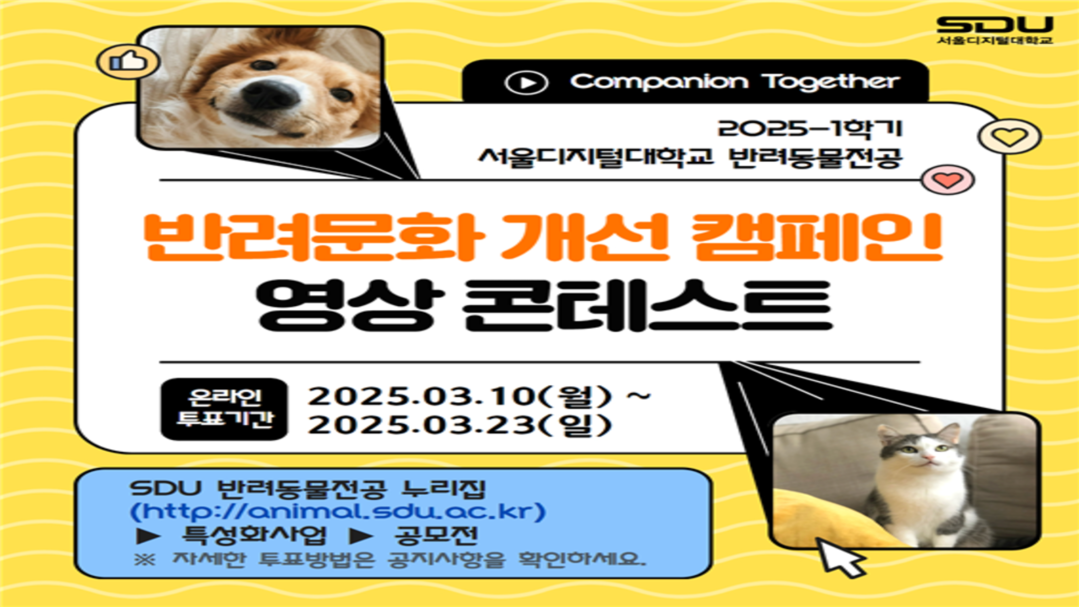 [대학저널 이선용 기자] 서울디지털대학교 반려동물전공은 3월 23일까지 올해 첫 ‘컴패니언 투게더: 반려문화 개선 캠페인’의 영상 콘테스트 우수작을 뽑는 온라인 시민투표가 시작됐다고 10일 밝혔다.