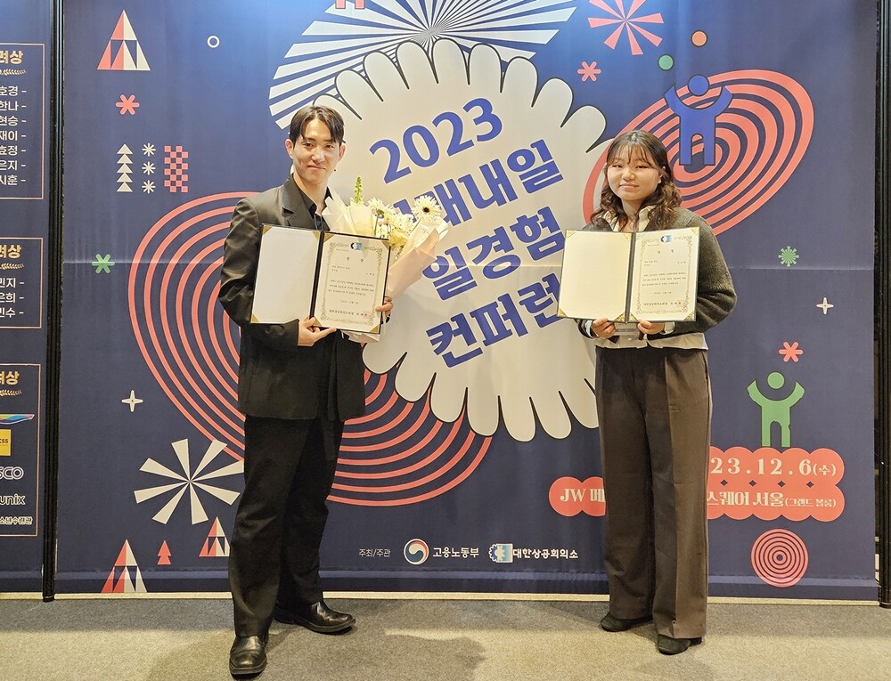 우수상을 받은 노하준 학생과 김한별 학생이 기념사진을 촬영하고 있다. 사진=영남이공대 제공 |