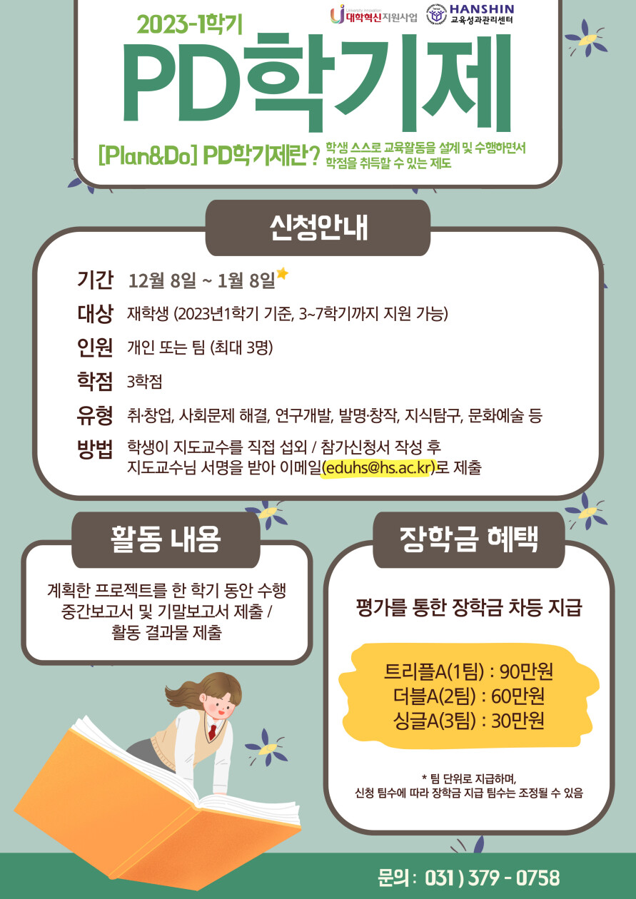 한신대 PD학기제는 학부생 대상 자기주도설계기반 학사제도로, 지난 2020년 1학기부터 대학혁신지원사업의 하나로 매 학기 실시되고 있다.