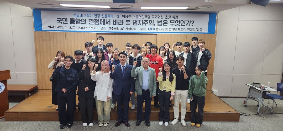 11월 2일 오후 3시 인천대 교수회관 세미나실에서 열린 ‘2023학년도 2학기 인천대 법학부 전공 진로특강–3’에 참여한 박용진 의원은 ‘국민통합의 관점에서 바라본 법치주의, 법은 무엇인가?’를 주제로 특강했다.