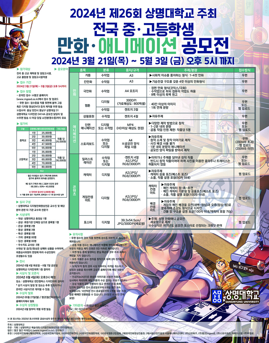상명대학교 중·고생 만화·애니메이션공모전은 4년제 대학 가운데 가장 오랜 전통을 자랑하고 있으며, 중·고등부로 나뉘어 카툰, 칸만화, 극만화, 웹툰, 상활표현, 단편애니, 스토리보드, 일러스트레이션, 캐릭터, 게임컨셉아트, 포스터 등 11개 부문으로 공모했다.
