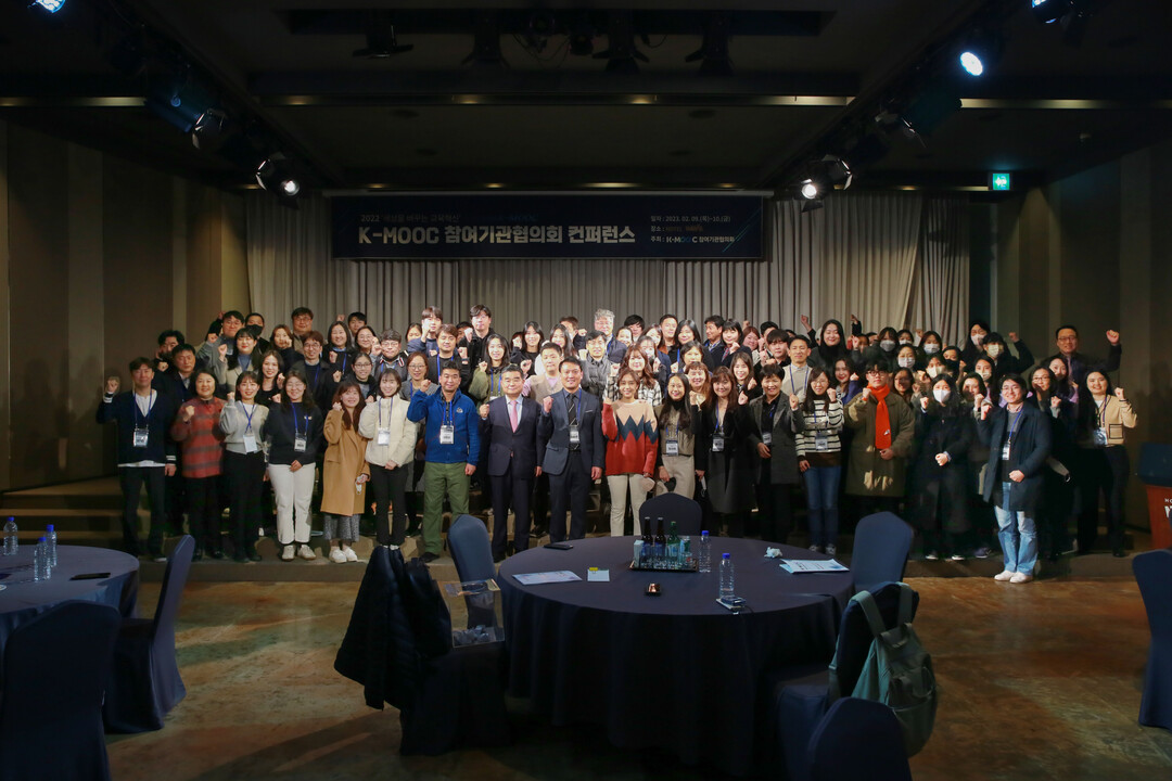 | 건양사이버대가 지난 9~10일 제주 난타호텔에서 주최한 2022 K-MOOC 참여기관협의회 콘퍼런스 참석자들이 기념촬영하고 있다. 사진=건양사이버대 제공 |