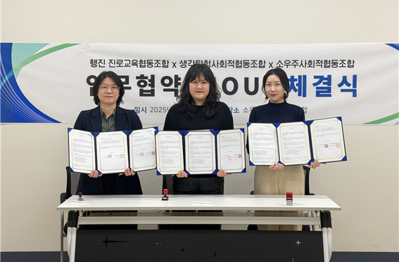 지난 3일 경기도 화성시에 위치한 소우주사회적협동조합 사무실에서 소우주사회적협동조합, 행진진로교육협동조합, 생각탐험사회적협동조합이 지역사회 교육 발전과 사회적 가치를 실현하기 위해 MOU(업무협약)를 체결했다.