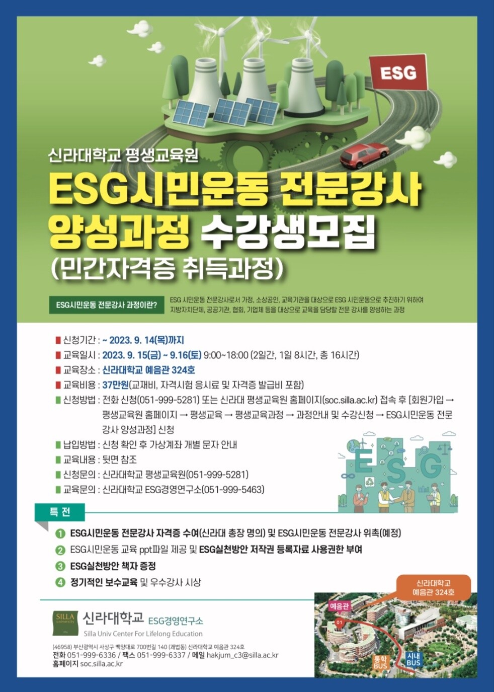 이번에 모집하는 ‘제2차 ESG시민운동 전문강사 양성과정’은 9월 15일부터 16일까지 이틀간 진행하는 민간자격증 취득과정이다.