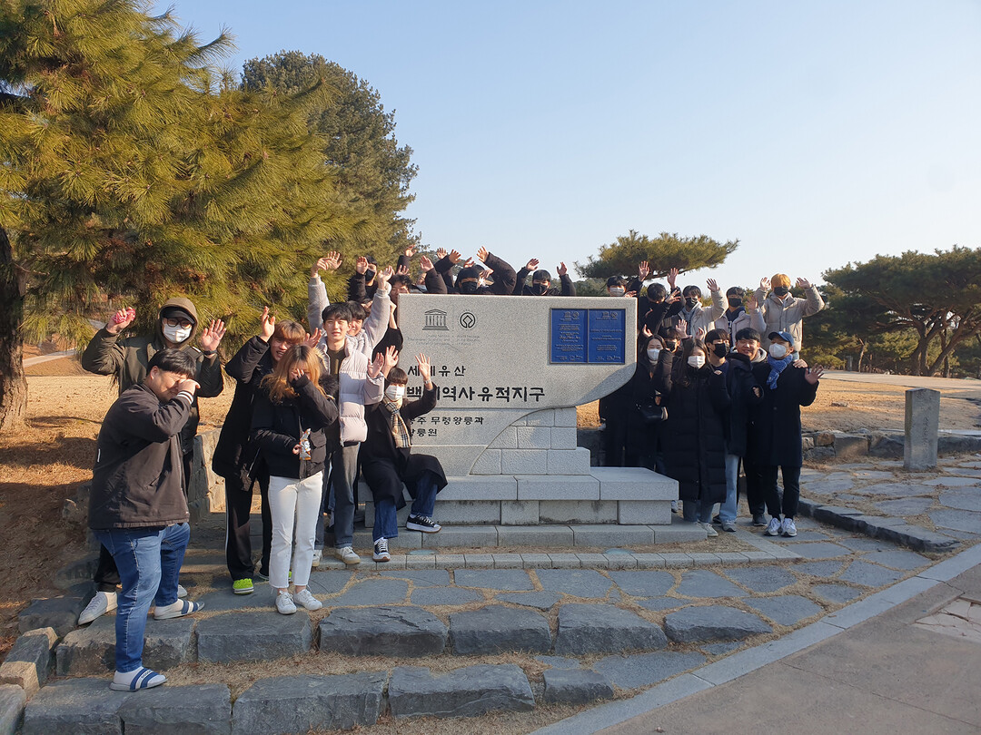 | 공주대 지방교육정책개발원이 실시한 '역사책 속 내 고장 바로알기' 현장체험에 참가한 학생들이 백제역사 유적지구 표지석을 둘러싸고 기념사진을 찍고 있다. 사진=공주대 제공 |