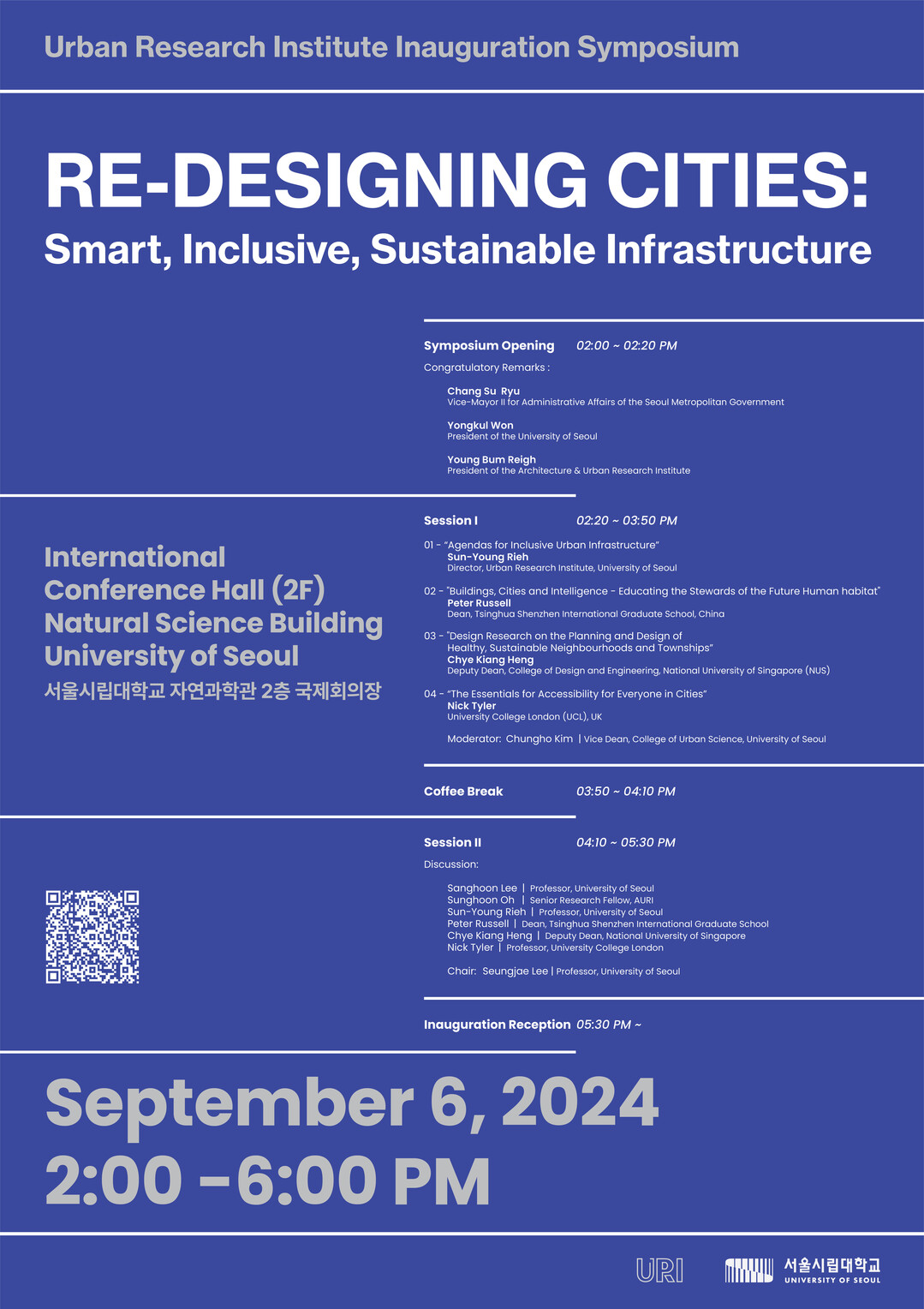해외 초청 연사로는 국립싱가포르대학교 디자인공학대학 학장 차이 키앙 헹(Chye Kiang Heng), 청화대 청화·선전 국제대학원 원장 피터 러셀(Peter Russell), 유니버시티칼리지런던(UCL) 교통연구센터 센터장 닉 타일러(Nick Tyler) 등이 참여할 예정이다. 이들은 각자의 발표를 통해 도시의 미래를 재설계하는 데 필요한 전략과 접근법을 제시하고, 국제적 협력의 중요성을 강조할 것으로 기대된다.