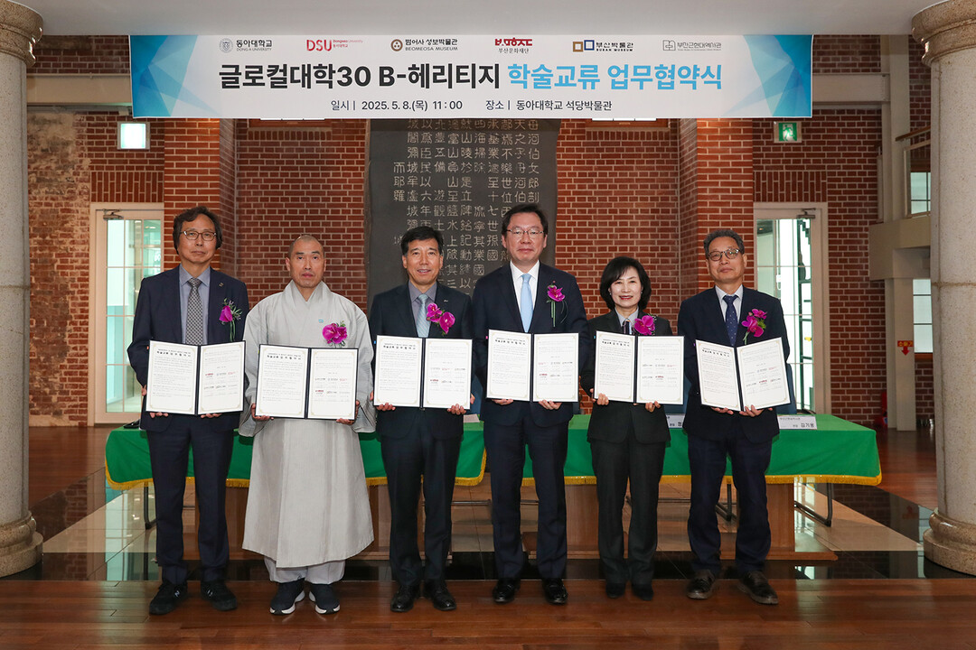 [대학저널 이선용 기자] 동아대학교는 글로컬 연합대학인 동서대학교와 함께 지역 대표 문화유산 기관인 범어사 성보박물관·부산문화재단·부산박물관·부산근현대역사관과 ‘글로컬대학30 B-헤리티지 학술교류’ 추진을 위한 업무협약을 체결했다고 9일 밝혔다.