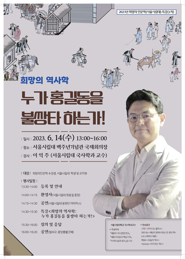 국사학과 이익주 교수가‘누가 홍길동을 불쌍타 하는가!’라는 제목으로 신분차별ㆍ서얼차별ㆍ남녀차별 등 차별의 역사를 살펴보고 현대 사회에서 차별의 양상과 의미에 대해 함께 생각하는 시간을 마련할 예정이다.