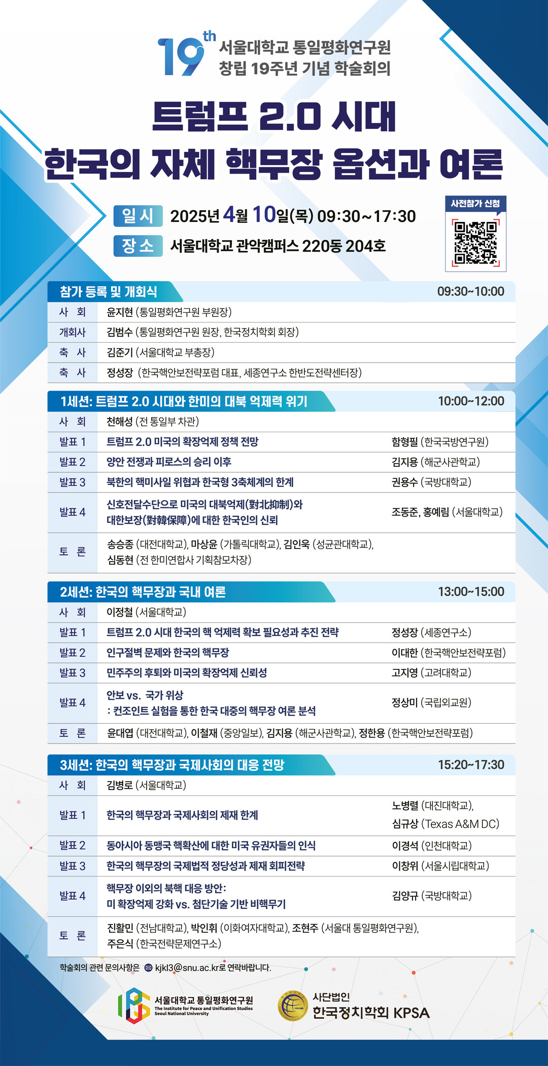학술회의는 총 3개 세션으로 구성된다. 제1세션 <트럼프 2.0 시대와 한미의 대북 억제력 위기>는 천해성 전 통일부 차관의 사회로 진행된다.