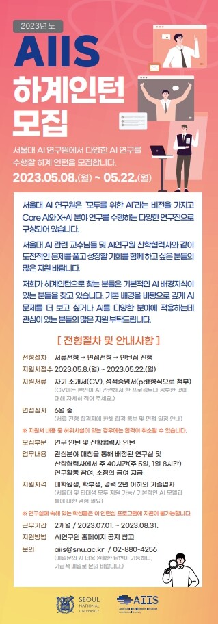 서울대는 지난해에 이어 이번 인턴십에서도 지원자의 관심 분야 1:1매칭을 통해 맞춤형으로 진행한다. 선발된 인턴의 지원분야에 맞춰 실제 AI 연구를 수행하고, 이를 통해 본인의 역량을 발휘하고 관련 경력 개발 기회를 제공한다.