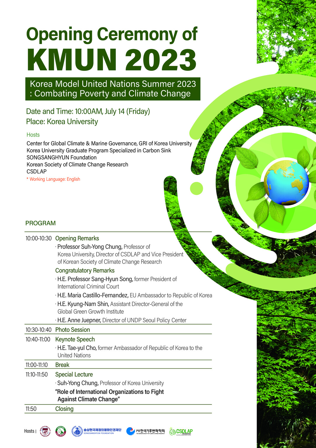 정서용 고려대 국제기후해양거버넌스센터장은 “국제 사회 구성원의 협력을 이끌어내고 있는 유엔을 비롯한 국제기구의 역할에 대해서 전국의 중고교생 및 대학생들이 다양한 역할로 참여해 세계 곳곳에 새로운 변화를 이끌어내는 글로벌 리더로 거듭날 수 있는 계기가 되기를 바란다”고 밝혔다.