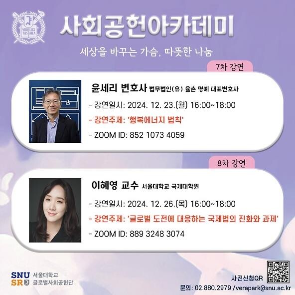 제8차 사회공헌아카데미는 26일 오후 4시 이혜영 교수(서울대 국제대학원)가‘글로벌 도전에 대응하는 국제법의 진화와 과제’을 주제로 강연한다. 이혜영 교수는 국제사법재판소의 동향을 통해 국제규범과‘공동의 이익(common interest)’이 국제평화와 인권, 환경을 어떻게 옹호하고 수호하는지 서울대 구성원과 함께 나눌 예정이다.