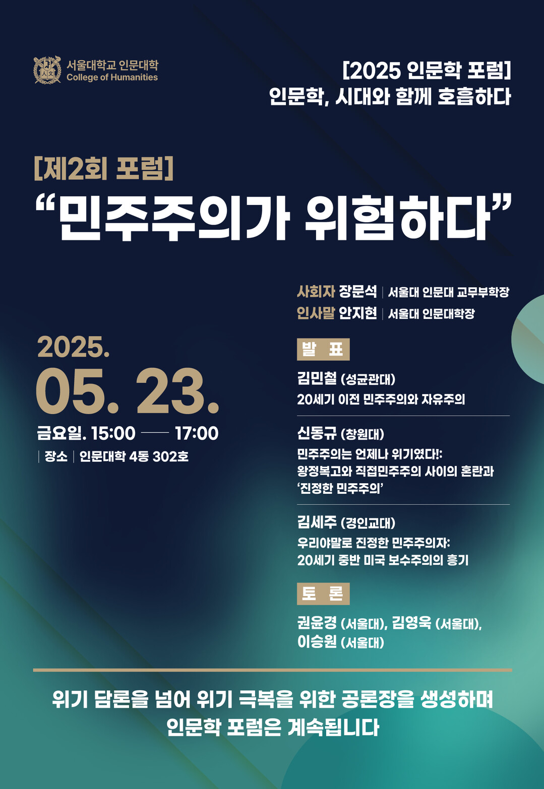 이번 제2회 포럼은 ‘민주주의가 위험하다’라는 부제 아래, 유럽과 미국의 역사적 사례를 통해 과거와 현재의 민주주의가 직면한 위기를 진단하고 그 극복 방향을 함께 모색하는 자리로 마련된다. 행사는 안지현 인문대학장의 인사말로 시작되며, 장문석 교무부학장의 사회로 세 개의 발표와 토론이 진행된다.