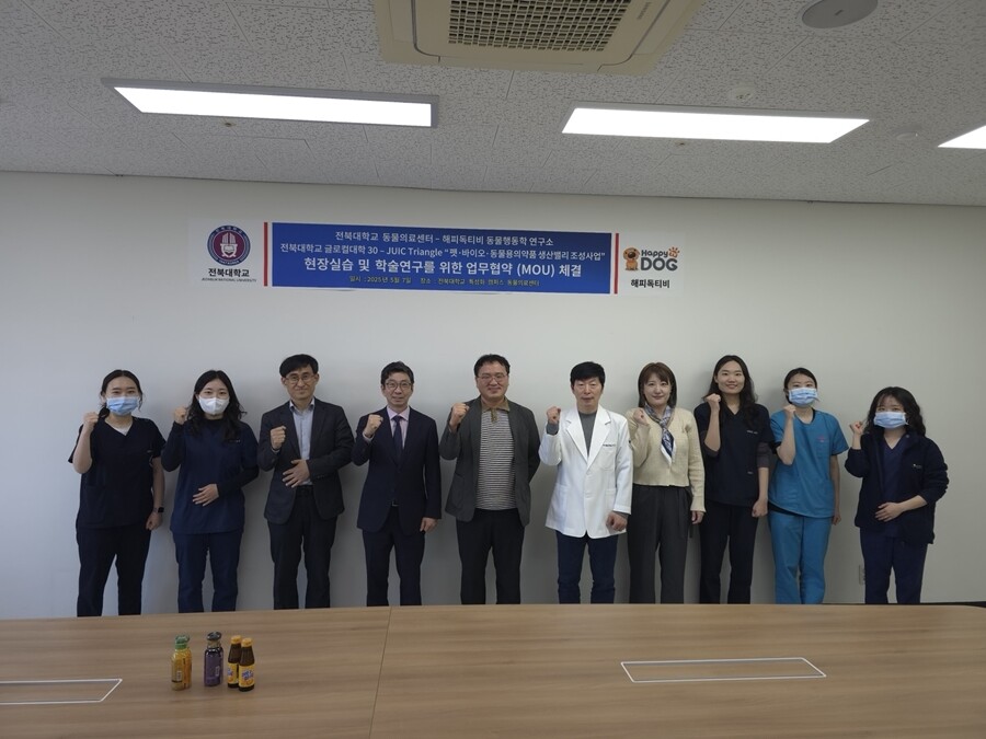 [대학저널 온종림 기자] 전북대학교 수의과대학과 반려동물 스트레스 완화 전문 OTT 서비스 ‘해피독TV’가 수의학 치료 분야에서 디지털 콘텐츠를 정식 활용하기 위한 업무협약(MOU)을 체결하고, 전북대 수의대 내에 ‘동물행동학 연구소’를 공동 설립했다.