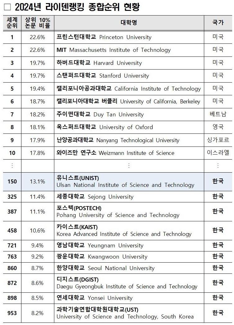 네덜란드 라이덴대학은 현지시간 3일 ‘2024 라이덴랭킹(CWTS Leiden Ranking)’을 발표했다. UNIST는 상위 10% 논문 비율 13.1%로 세계 150위, 국내 1위에 올랐다.