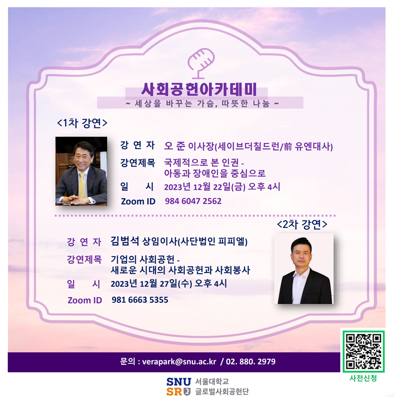 [대학저널 이선용 기자] 서울대학교 글로벌사회공헌단이 교내에 사회공헌 가치를 확산하고, 사회공헌을 직·간접적으로 체험할 수 있는 기회를 부여하기 위해 12월 22일과 27일 사회공헌아카데미를 개최한다.