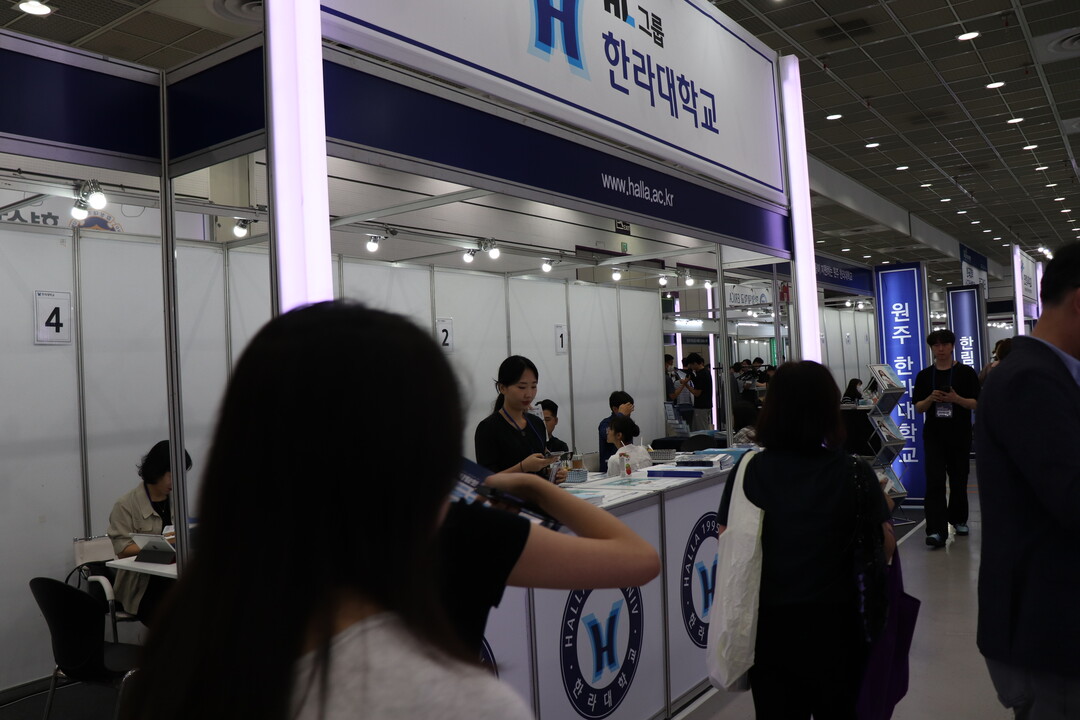 [대학저널 조영훈 기자]한국대학교육협의회가 주최하는 '2024학년도 수시 입학정보박람회'가 20일 서울 삼성동 코엑스에서 개막됐다. 오는 22일까지 열리는 수시박람회에는 전국 146개 대학이 참가하고 있다. 현재 수험생들이 대학부스에서 입시 상담을 진행하고 있다. 사진은 한라대학교 상담부스 모습.