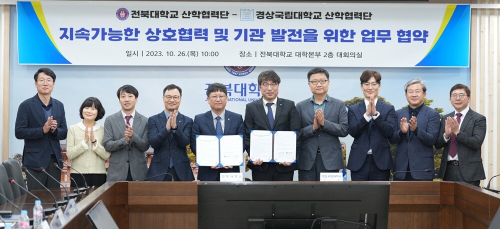 26일 전북대 대학 본부에서 열린 협약식에는 전북대 산학협력단 손정민 단장과 경상국립대학교 산학협력단 정재우 단장 등 대학 관계자들이 참석했다.