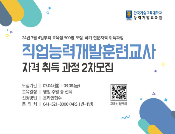 능력개발교육원은 올해 총 4차에 걸쳐 총 2,400여명의 직업훈련교사를 모집, 양성할 계획이며, 이번이 2회차 모집이다.