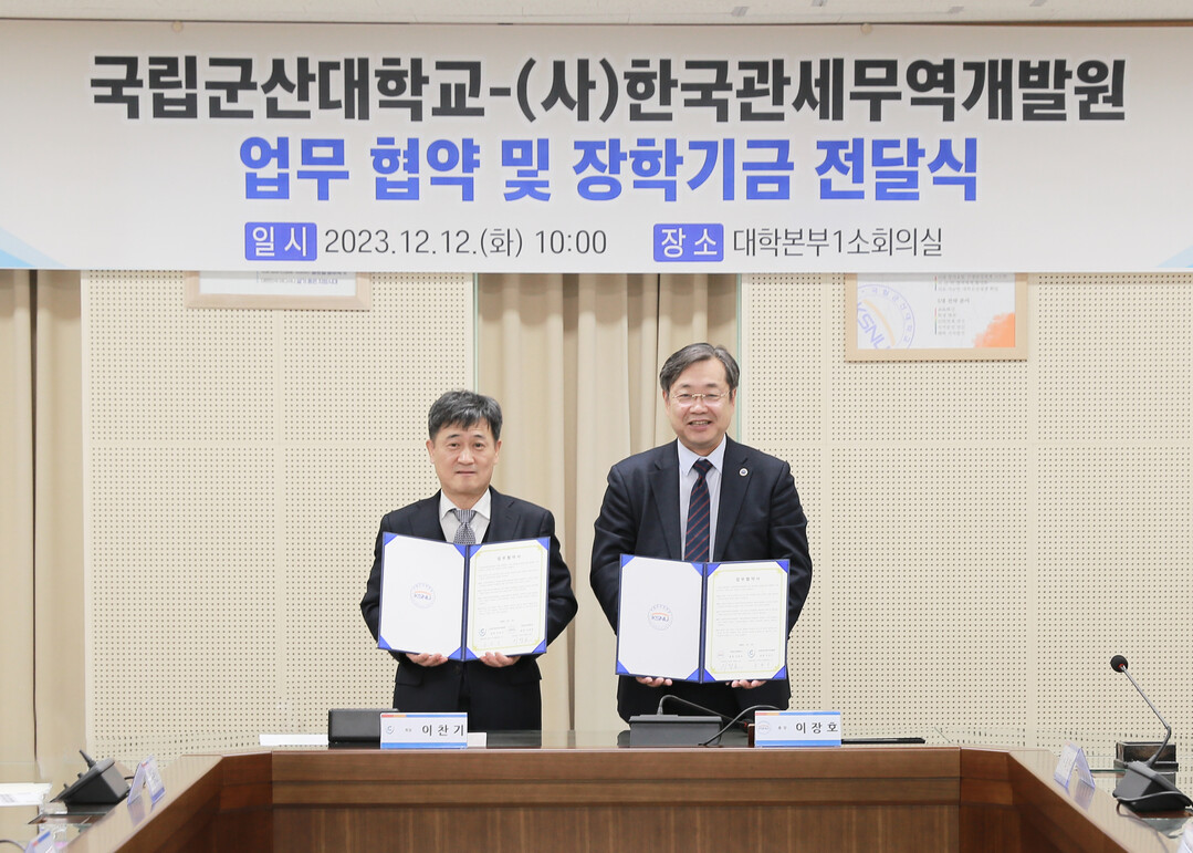 [대학저널 이선용 기자] 국립군산대학교와 (사)한국관세무역개발원가 12일 오전 대학본부 4층 제1소회의실에서 국내 물류산업의 발전 및 전문 인력양성을 위한 업무협약(MOU)을 체결했다.