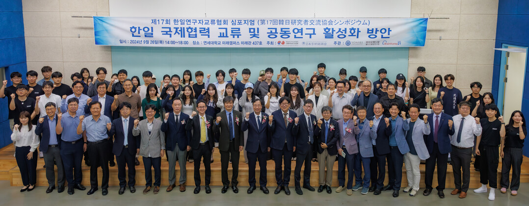 제17회 한일연구자교류협회 심포지엄 참석자들이 기념촬영을 진행하고 있다. 사진=연세대 미래캠퍼스 제공 |