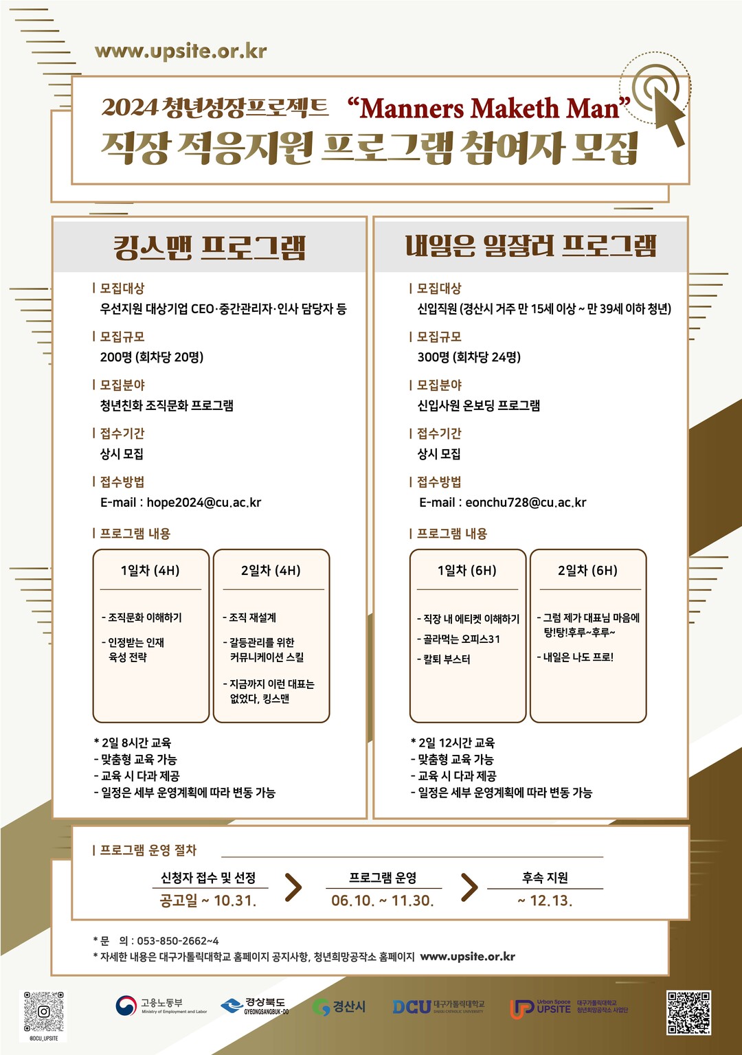 직장 적응지원 프로그램은 기업 CEO 및 중간관리자를 대상으로 조직의 트렌드를 이해하고 역량 강화를 지원하는 ‘킹스맨’, 입사 1년 미만 신입사원을 대상으로 하는 온보딩 프로그램 ‘내일은 일잘러’로 구성된다.