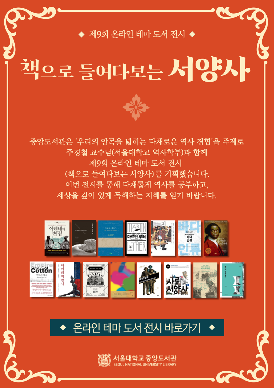이번 도서전의 주제는 <우리의 안목을 넓히는 다채로운 역사 경험>으로, 주경철 교수(서울대학교 역사학부)가 추천한 도서 15선과 추천사, 관련 미디어 자료 등이 전시된다.