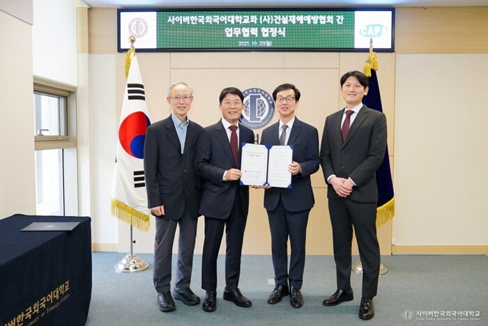 이날 오전 사이버한국외대 사이버관에서 열린 협약식에는 김병철 사이버한국외대 총장직무대행, 윤영근 산업안전·주택관리학부장, 이진섭 건설재해예방협회 회장, 김중락 사무국장이 참석했다. 양측은 상호 협력을 통한 건설안전 강화와 전문인력 양성 기반 구축에 뜻을 모으며 협약을 체결했다.