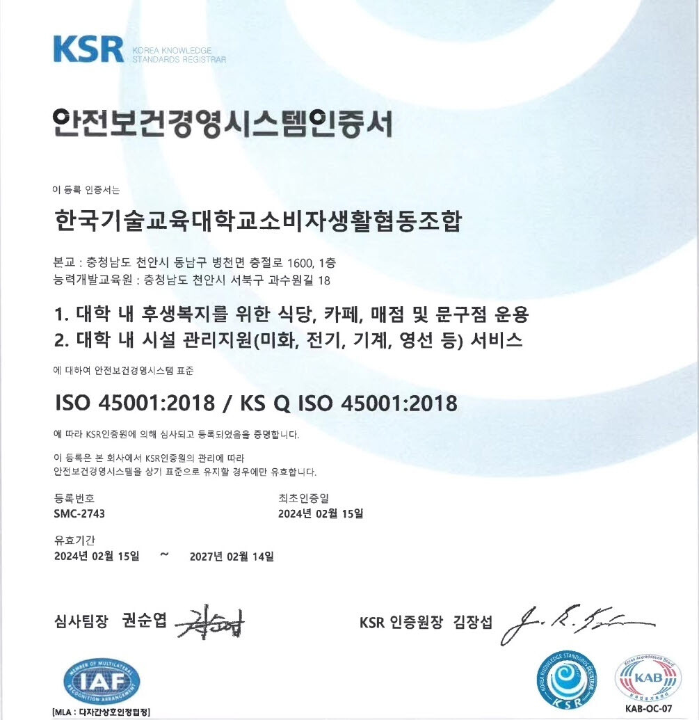 이번 국제인증은 국내 대학 부속기관과 생협 가운데 처음이다.한기대 생협은 2023년 10월부터 인증을 준비해왔으며, 안전보건경영시스템 구축·운영 상태가 ISO45001 요구사항에 부합해 심사를 통과했다.
