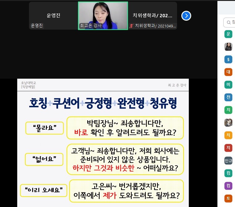 [대학저널 이선용 기자] 호남대학교 대학일자리플러스센터가 지난 6월 28일 취업준비생들을 위한 ‘예비직장인 교육 특강’을 실시간 비대면으로 진행했다.