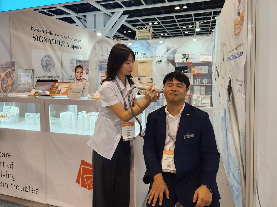 홍콩에서 열린 코스모프로프 아시아 박람회 2024에 참가한 인하대 GTEP 사업단 학생이 제품 시연을 하고 있다. 사진=인하대 제공