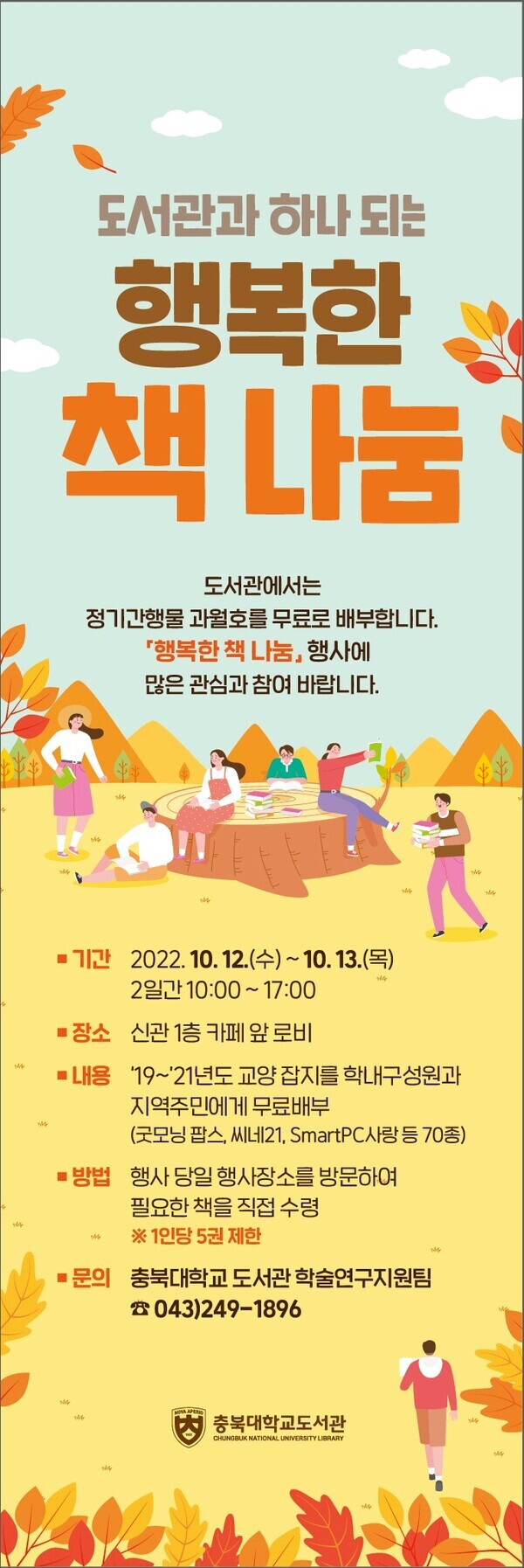 오전 10시부터 오후 5시까지 1인당 5권으로 제한해 배부한다. 학생 등 학내 구성원 외에도 충북대 도서관을 이용하는 일반 이용자들도 참여할 수 있다.