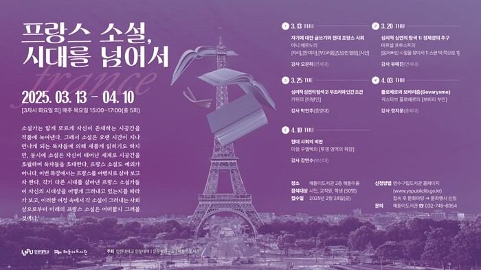 이번 특강은 △ 3/13 ‘자기에 대한 글쓰기와 현대 프랑스 사회’(오은하, 연세대), △ 3/20 ‘심리적 심연의 탐색 1: 정체성의 추구’(유예진, 연세대), △ 3/25 ‘심리적 심연의 탐색 2: 부조리와 인간 조건’(박언주, 중앙대), △ 4/3 ‘플로베르와 보바리즘’(정지운, 충북대), △ 4/10 ‘현대 사회의 비판’(강민수, 부산대) 순으로 진행될 예정이며, 자세한 내용은 해돋이도서관 홈페이지를 참조하면 된다.