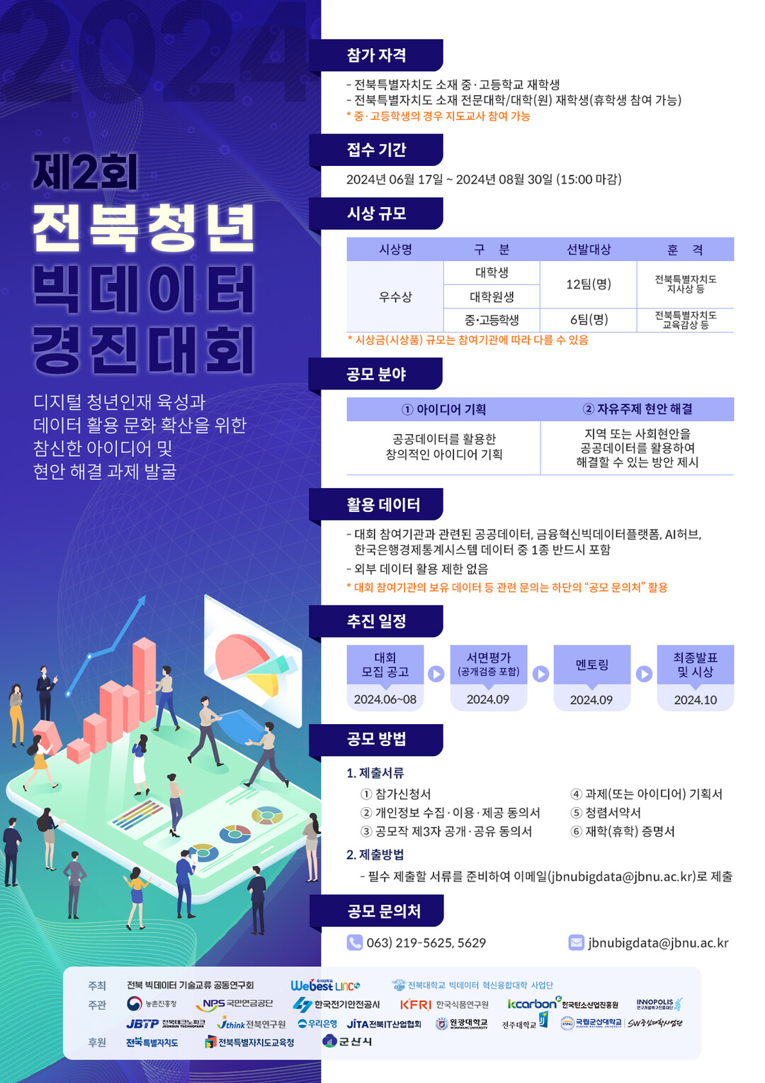 한편, 이번 대회는 전북대 빅데이터 혁신융합대학사업단과 전북 빅데이터 기술교류 공동연구회(유철중 회장), 우석대학교 LINC 3.0 사업단이 공동으로 주최한다. 대회와 관련된 자세한 사항은 소통24(구 온국민소통) 누리집과 참여기관 누리집 등에서 확인할 수 있다.