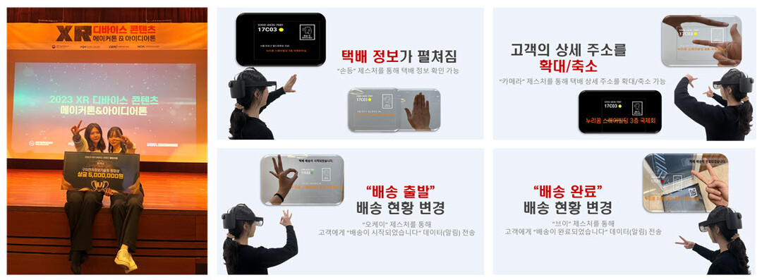 수상자 이세연(왼쪽), 이정은 학생(오른쪽)과 스마트 글래스를 활용한 택배 디지털 로지스틱스 서비스 시연 장면. 사진=한신대 제공 |