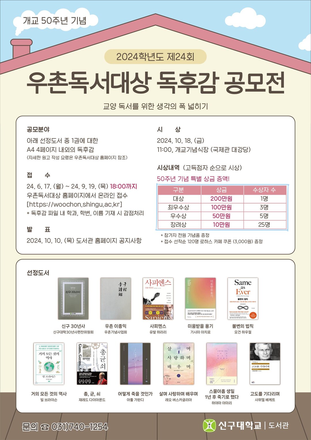 공모전은 재학생 누구나 참여할 수 있으며 접수는 6월 17일부터 9월 19일 오후 6시까지 진행된다. 참가자는 신구대 ‘우촌독서대상 독후감 공모전’ 홈페이지를 통해 원고를 제출해야 하며, 반드시 PDF 파일로 변환하여 제출해야 한다. 원고는 선정 도서 11권 중 하나를 선택해 작성하며, A4 4페이지 내외 분량으로 작성해야 한다.