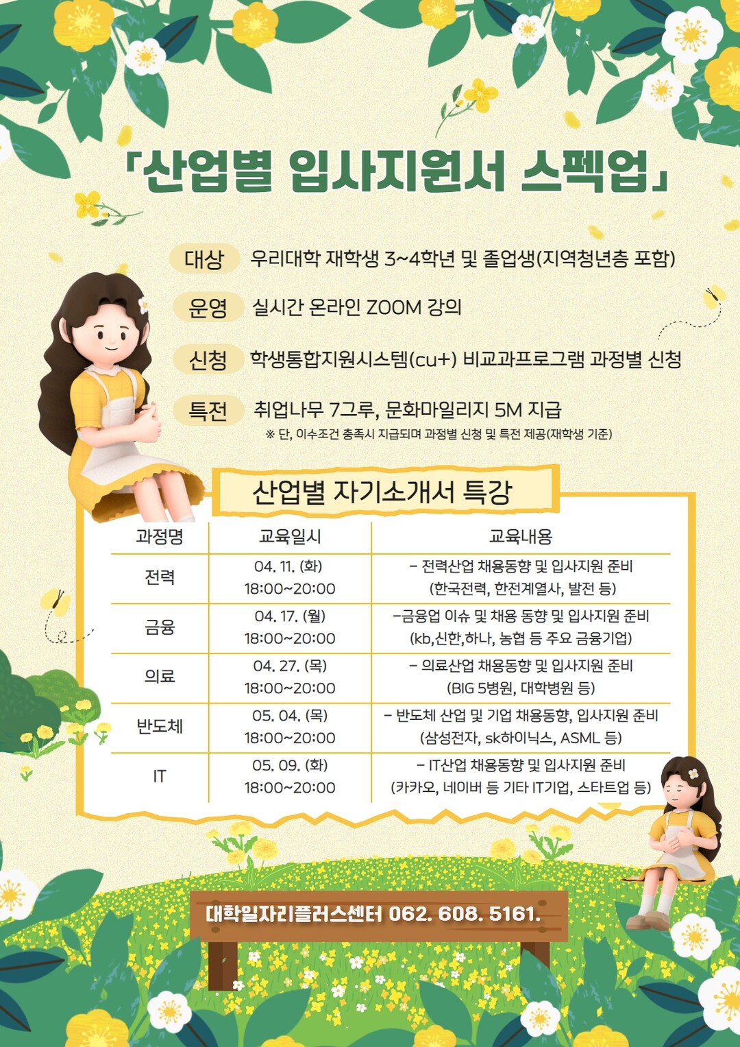 프로그램 참여는 취업 준비를 앞둔 재학생뿐만 아니라 졸업생, 지역 청년 등 누구나 가능하며, 조선대 학생통합지원시스템(cu+) 비교과프로그램에서 신청할 수 있다.