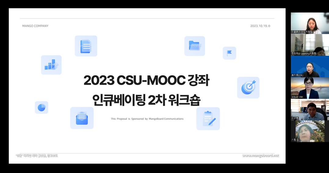 [대학저널 이선용 기자] 조선대학교는 교육혁신원 교수학습지원센터 E-Learning지원팀에서 진행한 2023년 CSU-MOOC 강좌 인큐베이팅 워크숍을 성황리에 마무리했다고 24일 밝혔다.