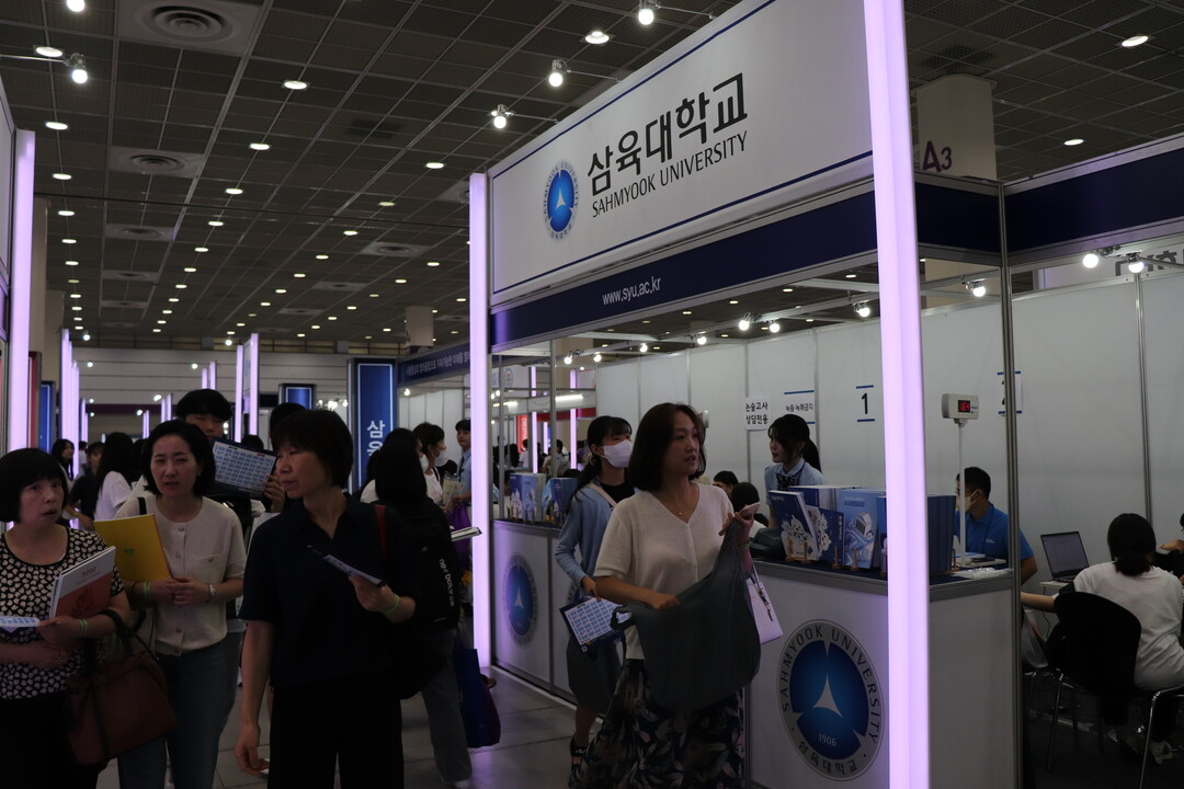 [대학저널 조영훈 기자] 한국대학교육협의회가 주최하는 '2024학년도 수시 입학정보박람회'가 20일 서울 삼성동 코엑스에서 개막됐다. 오는 22일까지 열리는 수시박람회에는 전국 146개 대학이 참가하고 있다. 현재 수험생들이 대학부스에서 입시 상담을 진행하고 있다. 사진은 삼육대학교 상담부스 모습.
