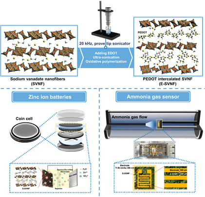 공동연구팀은 간단한 초음파화학법을 통해 기존 합성 과정이 복잡하다는 단점을 극복하고 수계 아연이온전지와 반도체 저항식 가스 센서에 동시 적용 가능한 복합소재를 개발했다. 연구팀은 초음파화학법으로 나노섬유형 금속산화물(sodium vanadate nanofiber, SVNF)의 결정층 내에 전도성 고분자(poly(3,4-ethylenedioxythiophene), PEDOT)가 삽입된 유·무기 복합소재(E-SVNF)를 합성하는 데 성공했다.