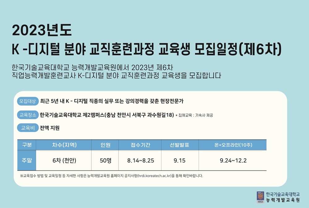 [대학저널 온종림 기자] 한국기술교육대학교 부설 능력개발교육원이 직업능력개발훈련교사(이하 직업훈련교사) 자격교육의 일환으로‘K-디지털 분야 교직훈련과정’교육생 50명을 14~25일 모집한다.