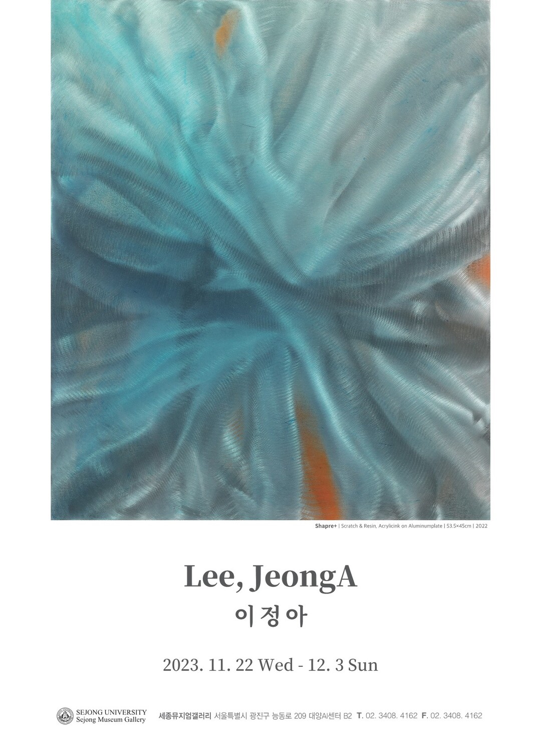 [대학저널 이선용 기자] 세종대학교 세종뮤지엄갤러리가 11월 22일부터 12월 3일까지 금속 플레이트 위에 샌딩 작업과 아크릴 안료 및 레진의 조화로운 결합으로 주목받고 있는 이정아 작가의 작품을 선보인다.