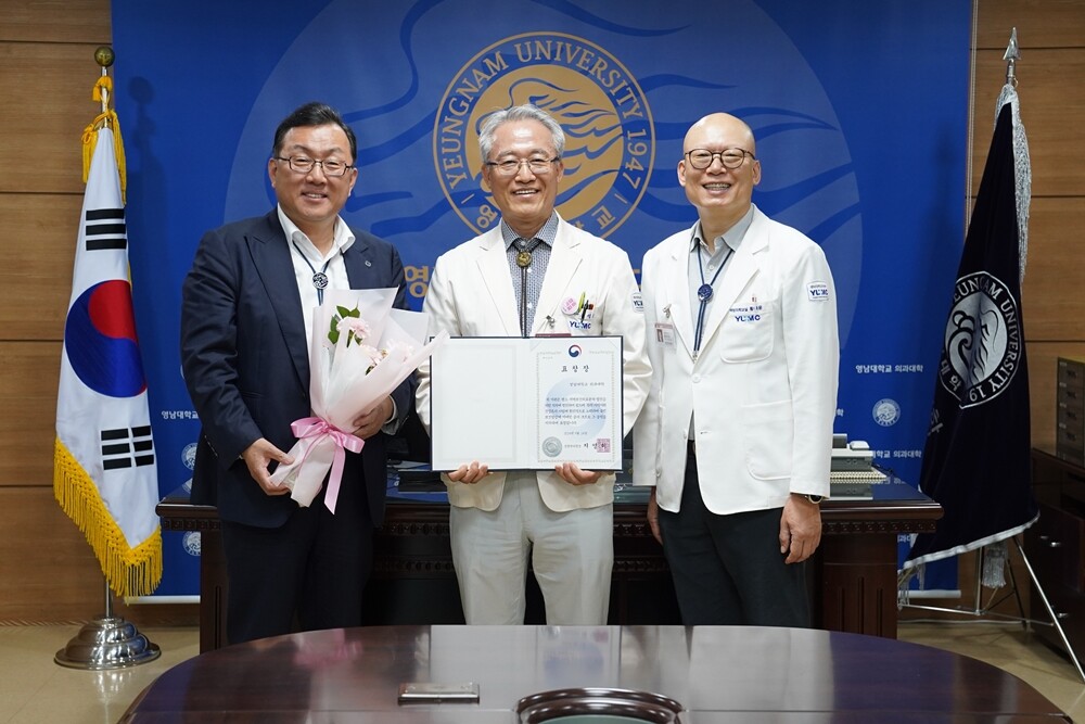 왼쪽부터 이경수 예방의학교실 교수, 김성호 의과대학 학장, 황태윤 예방의학교실 교수. 사진=영남대 제공 |