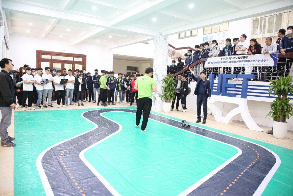 동아대와 베트남 하노이국립대 공대 학생들이 자율주행 경진대회를 하고 있다. 사진=동아대 제공